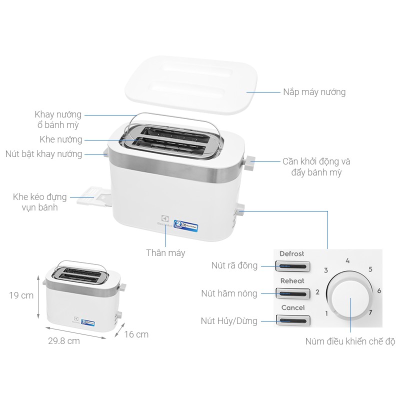 Điều chỉnh 7 mức độ giòn của bánh, nút nhấn để chọn chế độ phù hợp (rã đông, hấm nóng, hủy chọn), nút gạt để điều chỉnh khay nướng bánh.