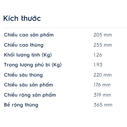 - Kích thước: 205 mm (C), 176 mm (S), 319 mm (R).