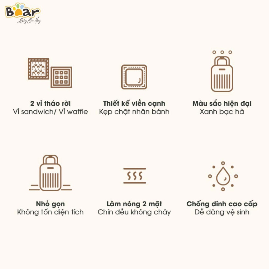 Thiết Bị Điện Gia Dụng > Đồ gia dụng nhà bếp > Máy nướng bánh || Máy nướng bánh mì kẹp nướng bánh Sandwich làm bánh Waffle, rán trứng xúc xích Bear DBC-P06N2 (Bảo hành 18 tháng)Còn hàng