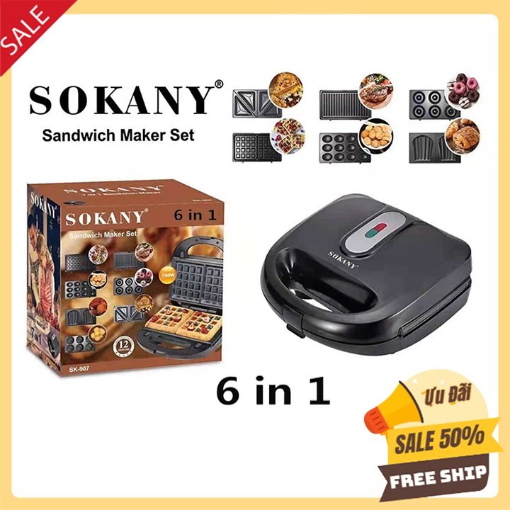 - Kẹp nướng bánh Sokany với thiết kế nướng 6 trong 1, với 6 bộ vỉ nướng đi kèm bạn có thể làm các loại bánh khác nhau như bánh sandwich, bánh waffle, bánh quy, bánh trứng,... hay nướng thức ăn trực tiếp ngay trên vỉ.