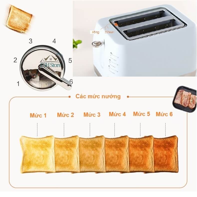 Với thiết kế nút vặn có thể điều chỉnh được 6 mức độ hâm nóng, tạo ra 6 cấp độ màu nâu của bánh mỳ khi nướng, từ đó giúp bạn dễ dàng điều chỉnh màu và độ giòn của bánh theo sở thích.