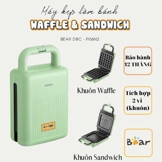 - Máy kẹp nướng bánh Bear có 2 loại vị thay thế: vỉ sandwich & vỉ wafle
