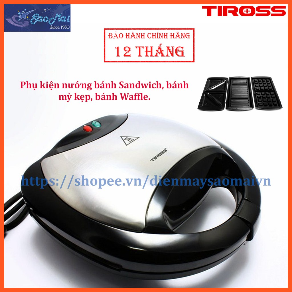 ✭ Máy nướng bánh 3 trong 1 Tiross TS-513 có 3 chức năng: nướng bánh Sandwich, bánh mỳ kẹp, bánh Waffle.Tiross TS-513 giúp bạn dễ dàng nướng bánh sandwich, bánh mỳ kẹp và bánh Waffle, nướng thực phẩm cho cả gia đình. Máy nướng bánh Tiross kèm 3 khuôn: khay nướng, khay Sandwich, khay nướng bánh giúp làm bánh chuyên nghiệp và đẹp mắt hơn. Khuôn bánh có tráng lớp chống dính giúp món ăn không bị cháy khi nướng và dễ vệ sinh hơn.