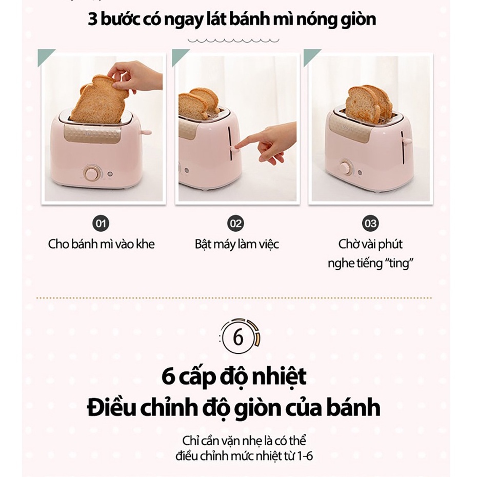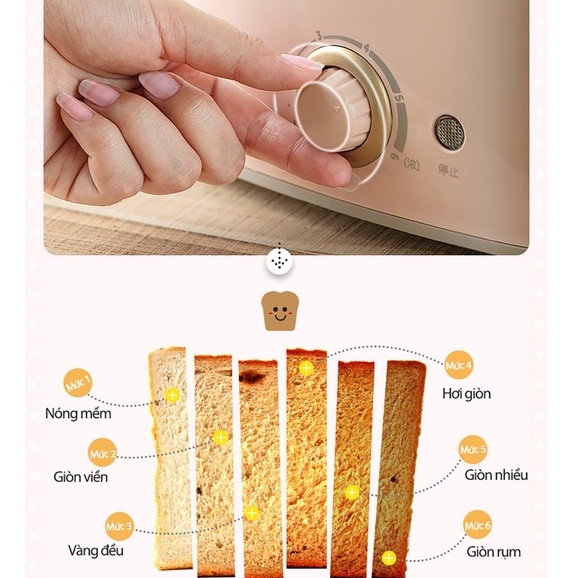 Với cấu trúc đơn giản, Bear DSL-601 chỉ cần bỏ bánh mì vào 2 khe của máy, nhấn nút và chờ tiếng "ting" là có thể thưởng thức những chiếc bánh mì giòn rụm, thơm lừng 6 cấp độ nhiệt. Với 6 cấp nhiệt độ khác nhau, bạn dễ dàng chọn được một kiểu bánh mì mà mình thích, chỉ hơi nóng, giòn ở viền mềm ở trong hay giòn rụm cả miếng đều được Bear DSL-601 nướng nhanh chóng.