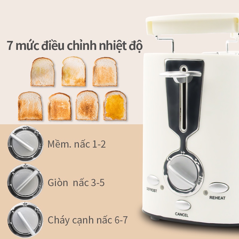 - 7 mức điều chỉnh nhiệt độ, bạn có thể tùy chọn độ cứng của bánh mì: Mềm. nấc 1-2, Giòn nấc 3-5, Cháy cạnh nấc 6-7.