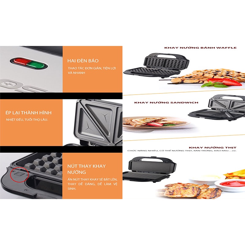 Một ưu điểm đặc biệt của chiếc kẹp nướng này đó là được tích hợp ba khay nướng đa chức năng, giúp bạn chế biến nhiều món ăn khác nhau như nướng bánh Waffle, nướng Sandwich, nướng thịt,... đáp ứng đầy đủ nhu cầu sử dụng cho gia đình.