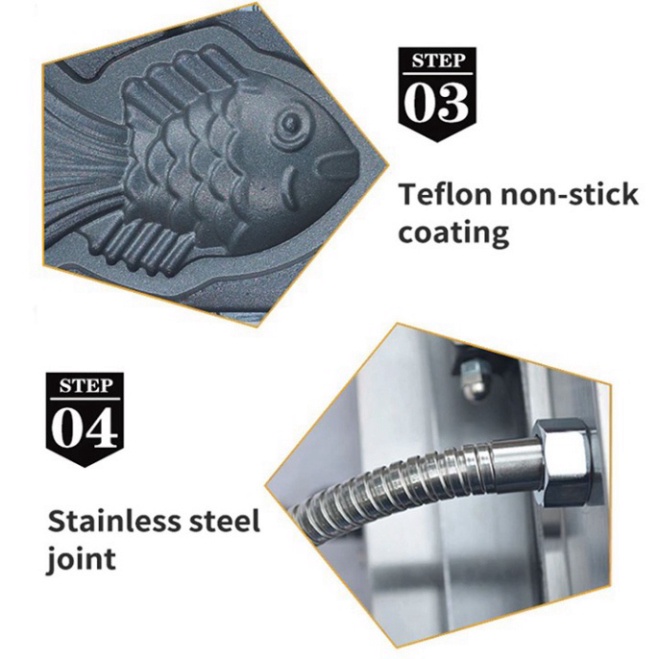 - Với mỗi lần nướng chỉ trong 2-4 phút, máy cho ra 6 chiếc bánh hình cá vàng thơm. Sử dụng chất liệu khuôn cao cấp, không làm ảnh hưởng đến hương vị của bột bánh và nhân bánh.