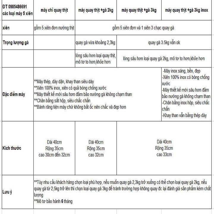 - Máy nướng thịt và gà 3kg: Mô tơ 14w,khỏe hơn, quay gà to hơn, 3.5kg trở xuống.