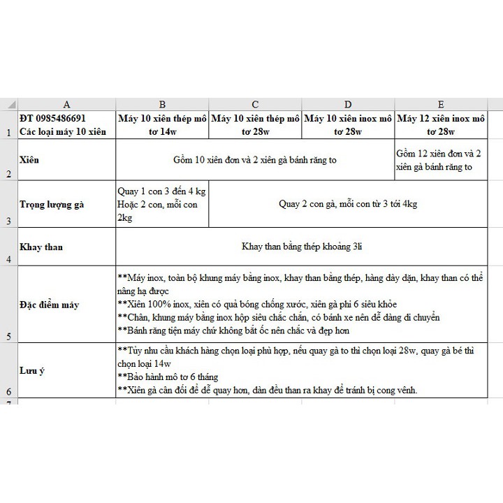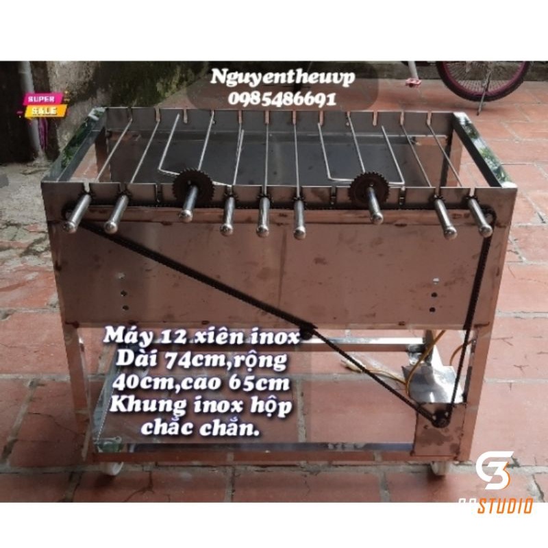 - Máy nướng thịt và gà 12 xiên inox: Mô tơ 28w, quay 2 gà khoảng 3kg (gồm 12 xiên đơn và 2 xiên gà)