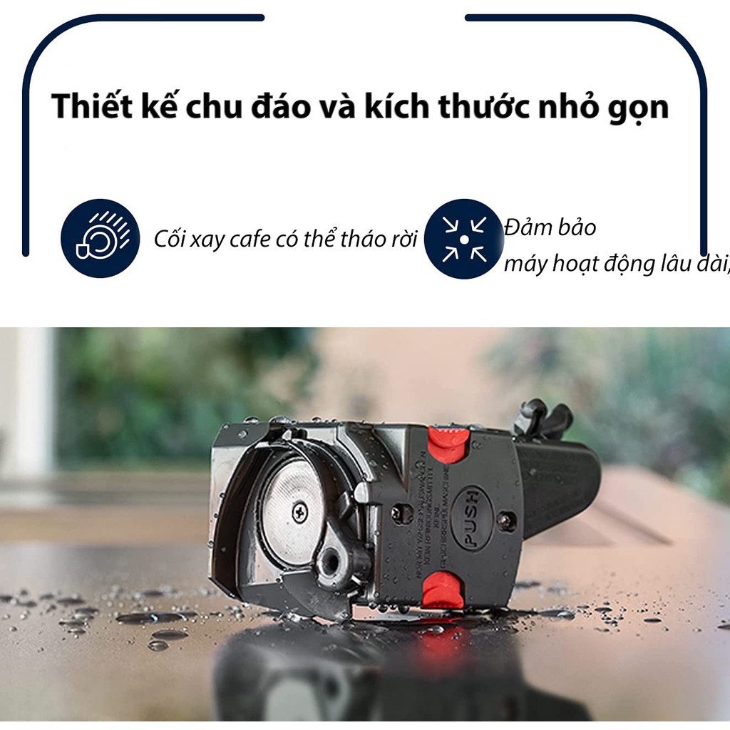 - Máy xay tích hợp với lưỡi dao làm bằng thép tiêu chuẩn Châu Âu. Lưỡi thép siêu cứng, có thể xay cả đá, gỗ, cành cây,… nếu cà phê có lẫn lộn vào trong.