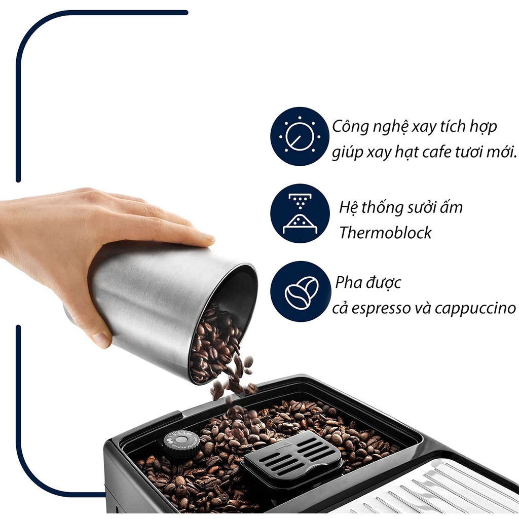 - Kiểm soát nhiệt độ: Nhờ hệ thống sưởi ấm Thermoblock hiện đại được sử dụng trong tất cả các máy tự động De’Longhi, cả espresso và cappuccino đều được ủ ở nhiệt độ hoàn hảo, đảm bảo trải nghiệm hương vị tuyệt vời.