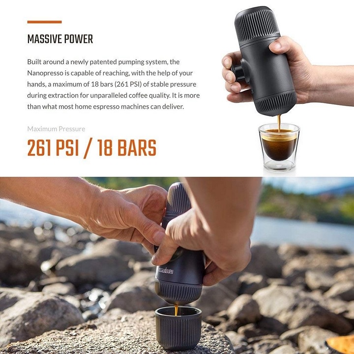Wacaco NanoPresso – dụng cụ pha Espresso thủ công siêu nhỏ với sức mạnh của một máy pha cà phê chuyên nghiệp. Cực kỳ phù hơp với những người thích Espresso. Bạn có thể thưởng thức ở mọi nơi bạn muốn: Đi làm, đi du lịch, phượt, cắm trại….
