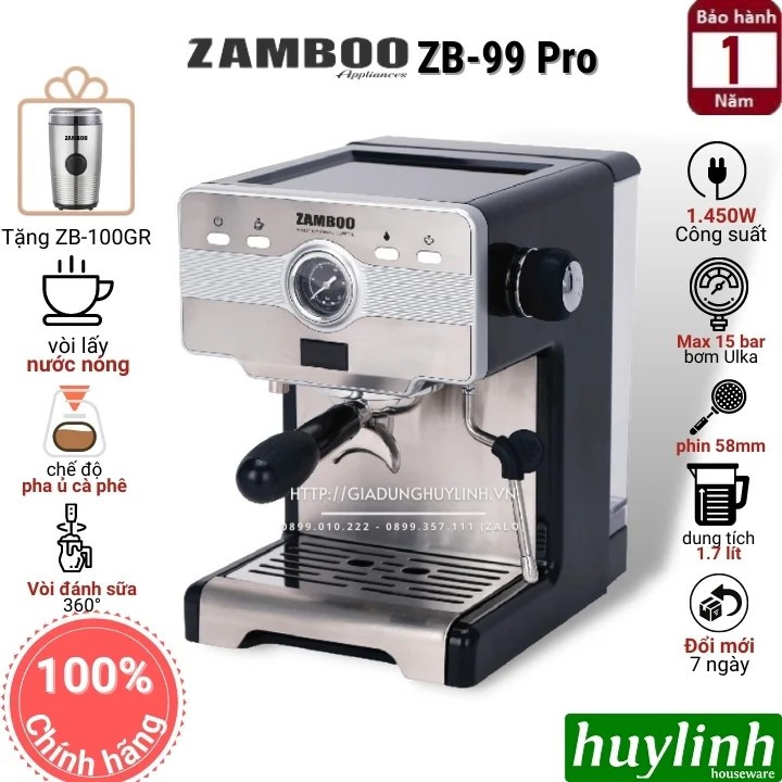 Máy pha cà phê Espresso Zamboo ZB-99 PRO là dòng máy pha gia đình nhưng mang phong cách chuyên nghiệp với phin 58mm, có đồng hồ hiển thị thời gian pha, áp lực bơm max 15 bar, thiết kế sang trọng, chắc chắn và cao cấp.Huy Linh phân phối và bảo hành chính hãng tại Zamboo Việt Nam