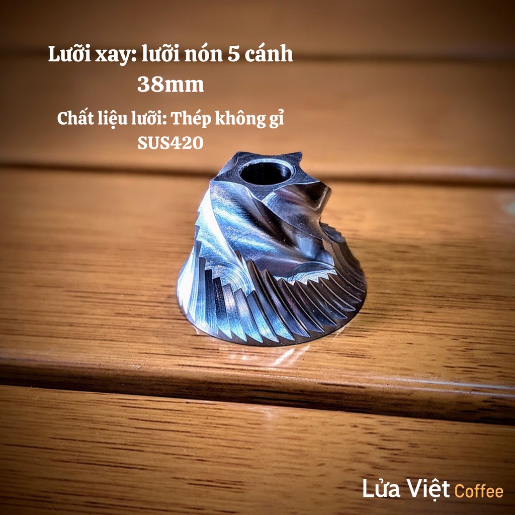 * Trục cối xay được làm bằng nhựa cứng polycarbonate, với 2 vòng bi cố định giúp hạn chế tình trạng rung lắc lưỡi khi xay, giúp cà phê xay ra được đều hơn và lưỡi xay được bền hơn. Cơ chế điều chỉnh cỡ xay bằng vặn “click” ở dưới đáy phần trên cối giúp người dùng có thể tinh chỉnh được chính xác cỡ xay, tránh tình trạng bị lệch cỡ trong quá trình xay.
