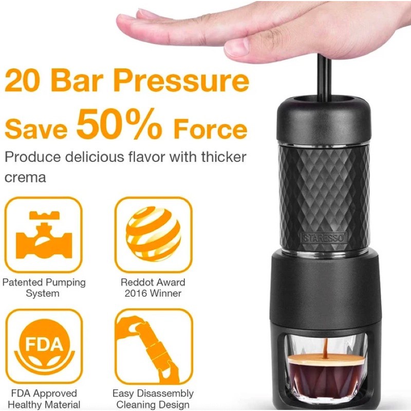 - So với các nhà sản xuất espresso cầm tay khác trên thị trường, các sản phẩm của Staresso có thể mang đến hương vị espresso phong phú, đạt được Golden Exaction Rate Coffee bằng cách sử dụng áp lực lớn. Lên đến 15 bar áp suất, bạn có thể pha nước nóng thông qua cà phê xay yêu thích của bạn.