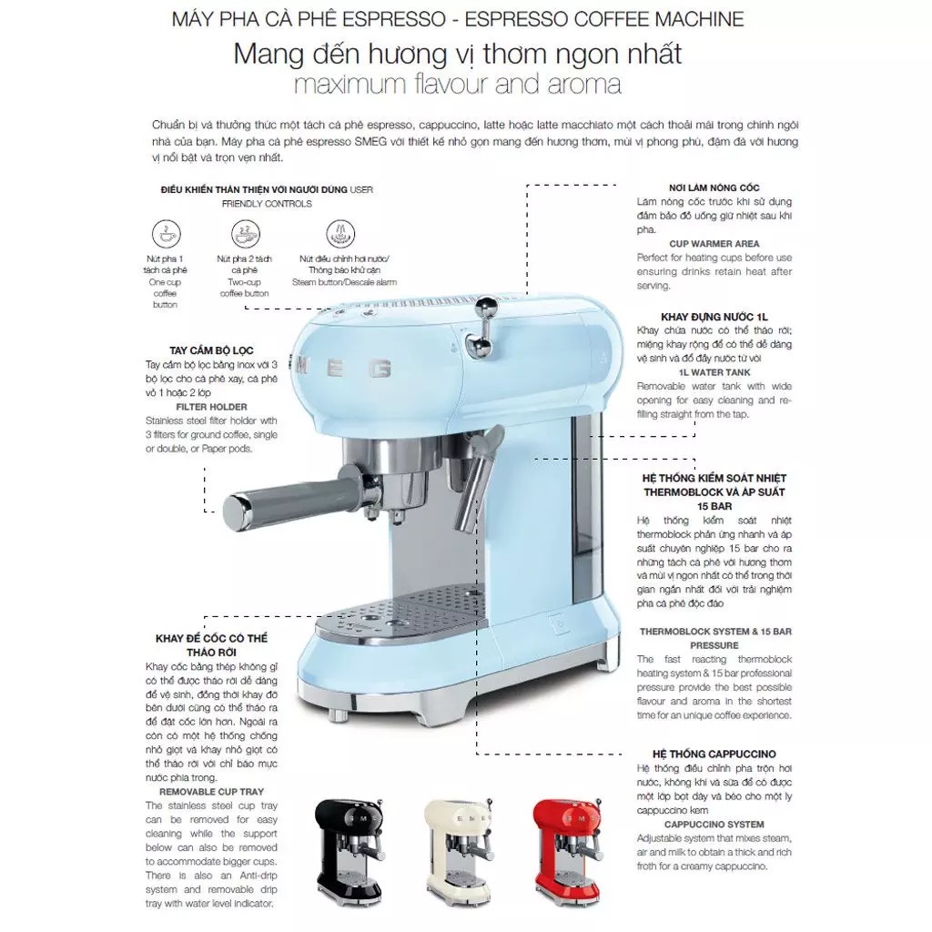 - Ngoài ra, nếu bạn thích một tách espresso, cappuccino, latte hoặc latte macchiato, Smeg ECF01 có thể giúp bạn pha chế và thưởng thức cà phê với sự thoải mái theo các của riêng bạn.