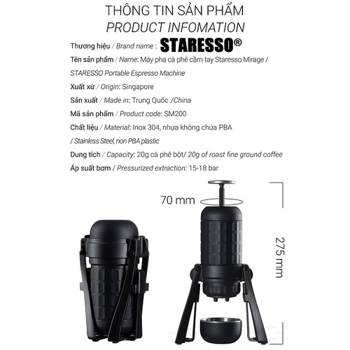 Tên sản phẩm: Máy pha Staresso Mirage cà phê espresso cầm tay- Công ty chịu trách nhiệm về hàng hóa: CÔNG TY TNHH CÀ PHÊ VOLCANO