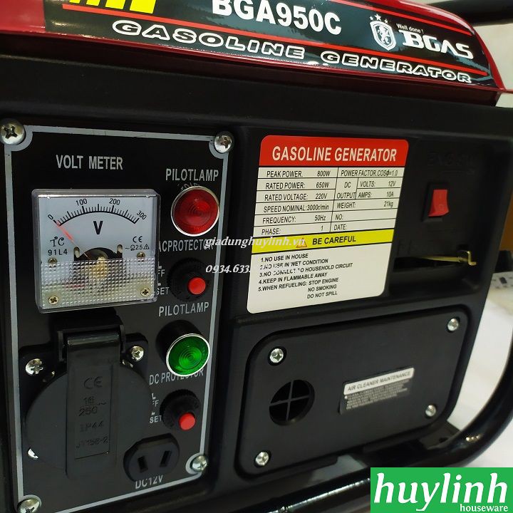 - Máy phát điện Bgas BGA950C hoạt động với công suất 0.8KVA (1000W) thích hợp sử dụng cho gia đình. Với mức công suất như vậy, người dùng có thể dùng đèn, quạt, nấu cơm bằng nồi cơm điện thoải mái trong nhiều giờ liền.