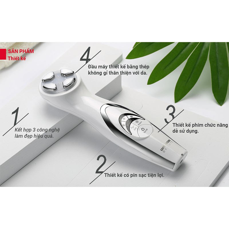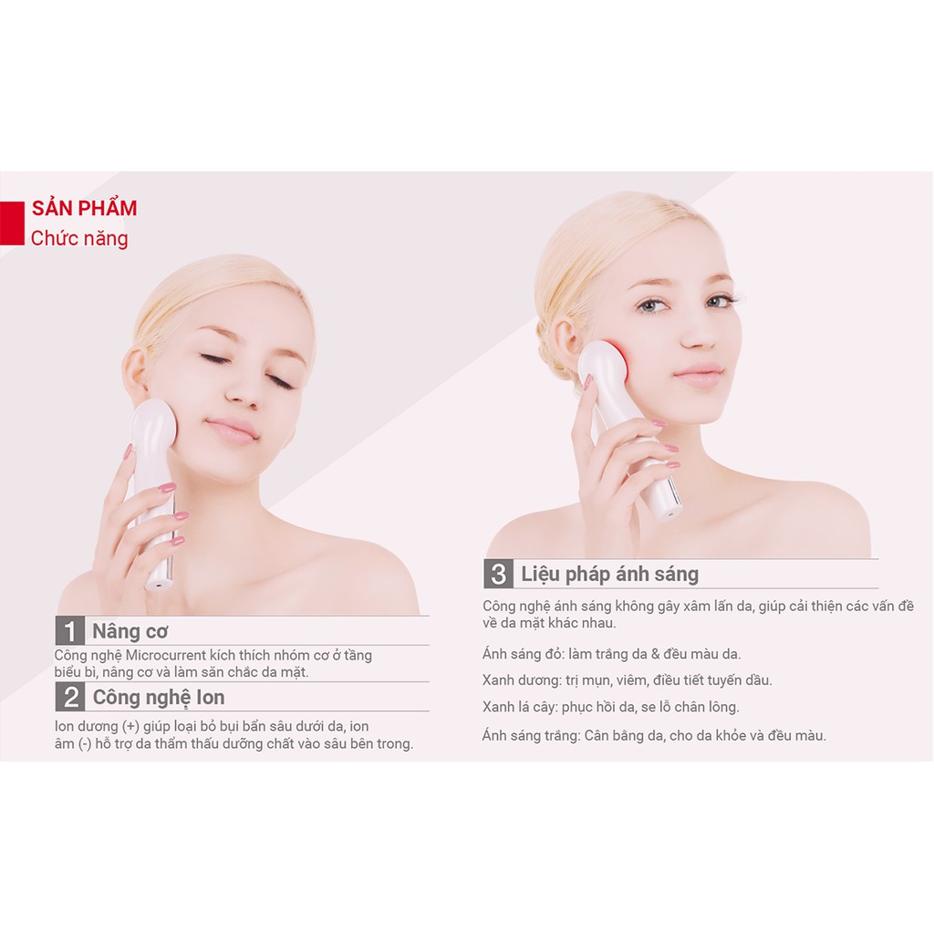 - Máy có ba liệu pháp bằng ánh sáng photon: Đỏ, xanh dương, xanh lá cây.