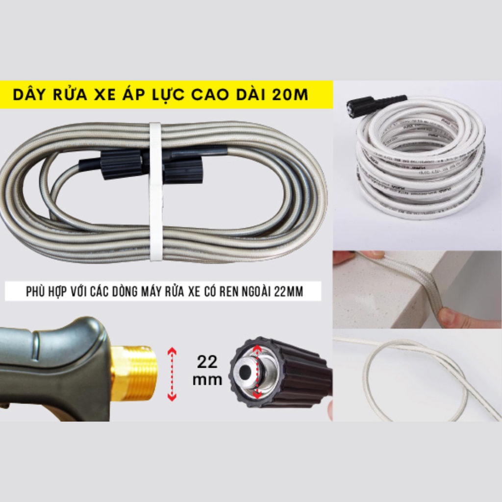 - Phụ kiện đi kèm: 1 súng phun, 1 đầu phun, dây phun cao áp: 10m, đầu phun có bình tạo bọt. Máy có bổ sung thêm bộ phận lọc cho tất cả các máy xịt rửa (Transparent Filter), dây nối từ vòi nước vào máy chính hãng dài 3M, . Chú ý dùng vòi nước để lấy nước từ nguồn nước thấp vào máy xịt rửa nên có chiều dài tối đa 2.5-3m