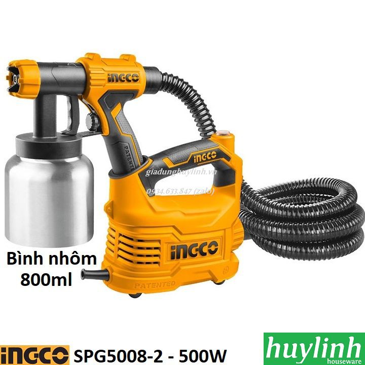 Máy phun sơn Ingco SPG5008-2 với công suất 500W, dung tích bình chứa bằng nhôm với dung tích 800ml,Huy Linh phân phối và bảo hành chính hãng tại Ingco Việt Nam.