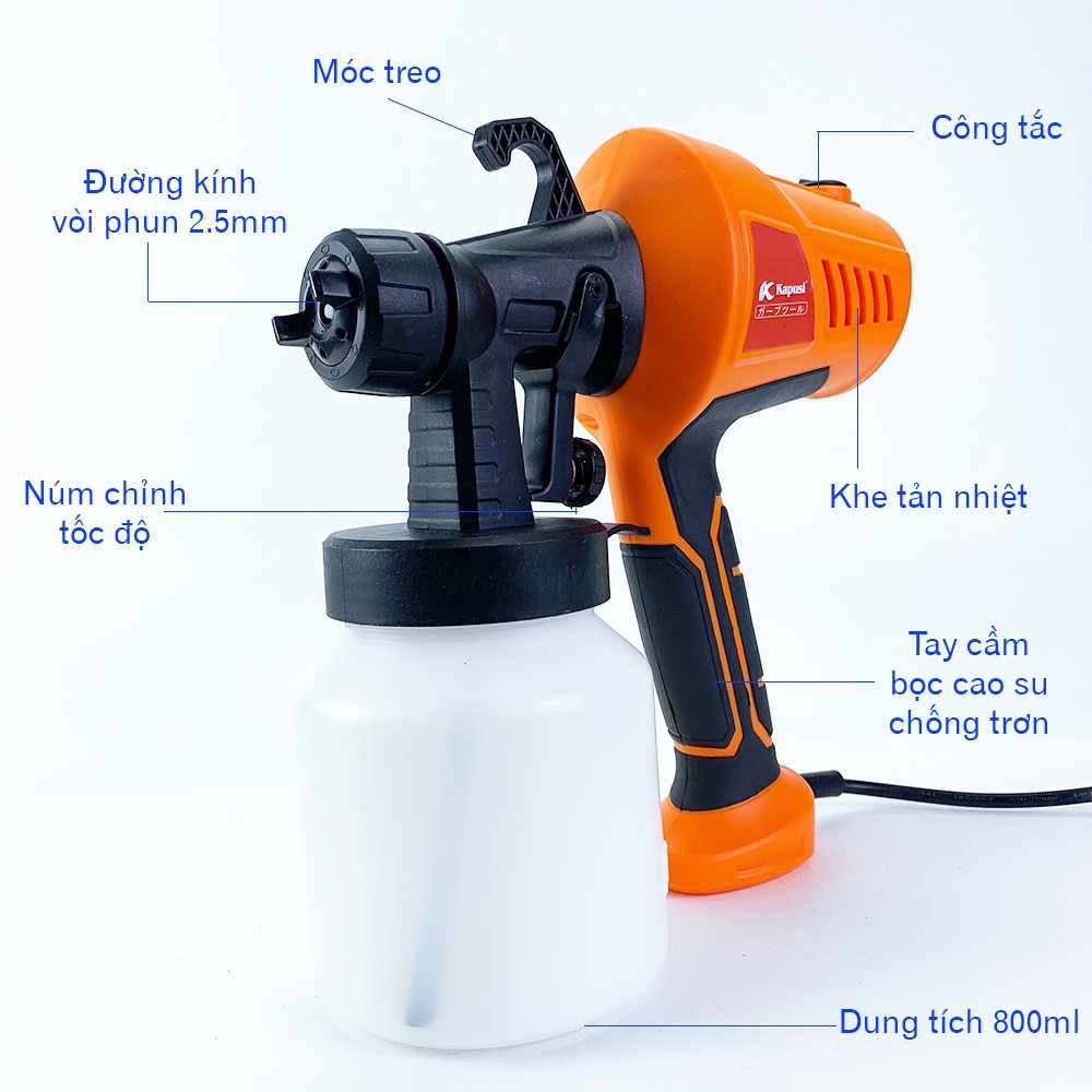 - Máy phun sơn điện cầm tay Kapusi Japan là thiết bị cao cấp đến từ nhà sản xuất máy móc và thiết bị cơ khí nổi tiếng Kapusi. Được chứng nhận chuẩn ANSI về chất lượng. Được tin dùng ở nhiều quốc gia trên thể giới.