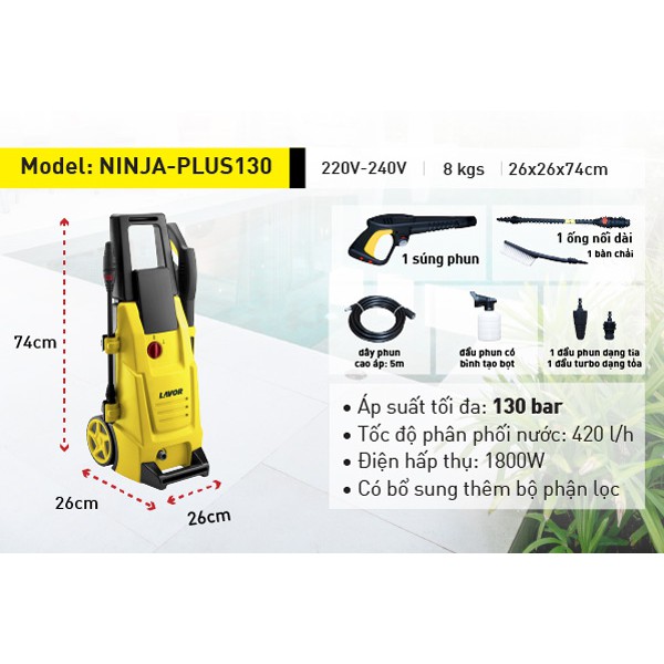 -Máy phun xịt áp lực cao Lavor Ninja plus 130 - Thương hiệu Italia lý tưởng để sử dụng cho gia đình. Máy phun rửa cao áp giúp tiết kiệm thời gian. Với áp lực nước cao giúp loại bỏ các vết bẩn một cách nhanh chóng, cho phép tẩy rửa các vết bẩn ở những vị trí khó thao tác như gầm xe, bánh xe một cách dễ dàng.