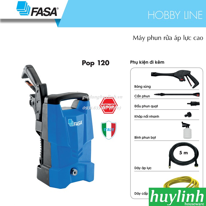 Máy rửa xe Fasa POP 120 với công suất 1700W mạnh mẽ với động cơ 100% lõi đồng được thiết kế từ Italy với áp lực phun lên tới 120 bar[Huy Linh miễn phí vận chuyển toàn quốc - vui lòng liên hệ nhân viên bán hàng: 0934.633.847]
