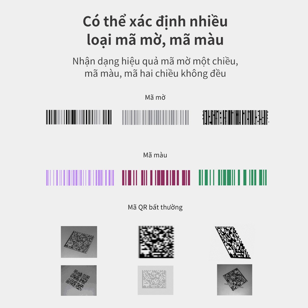 - Máy có thể quét 22 loại mã vạch. Đối với mã bị mờ, nhăn, máy có thể nhận biết 6 loại mã vạch.