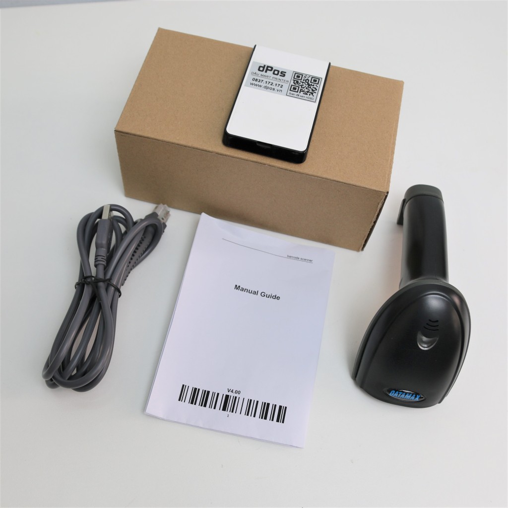 - Bạn mở hộp lấy Máy bắn mã vạch DM-C1200 và kết nối với dây USB rồi cắm vào cổng USB trên máy tính là có thể sử dụng ngay. Bạn nhớ giữ lại hộp máy và giấy chứa mã code trên trong hợp để sử dụng về sau.