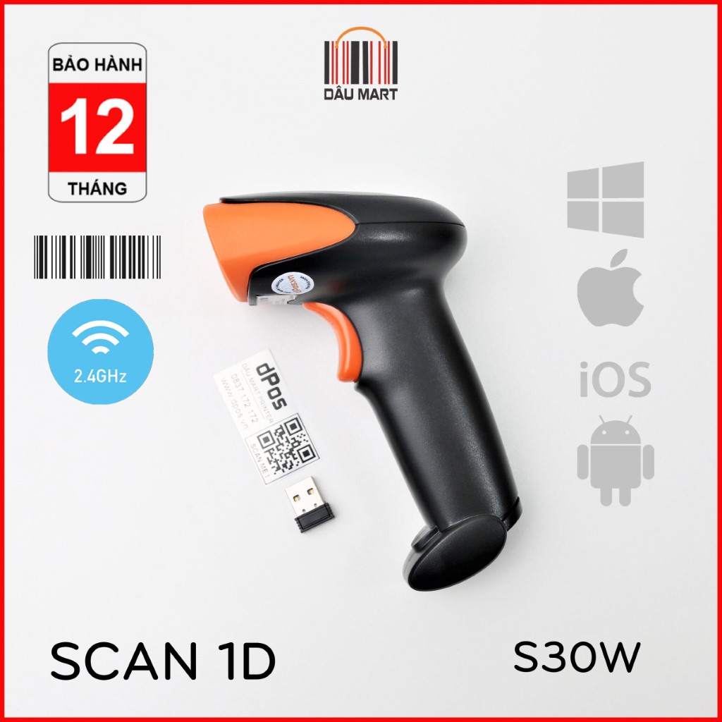 Máy quét mã vạch không dây dPos S30W Scan mã vạch Barcode 1D dành cho shop bán hàng quản lý kho xuất nhập hàng hóa TMĐT