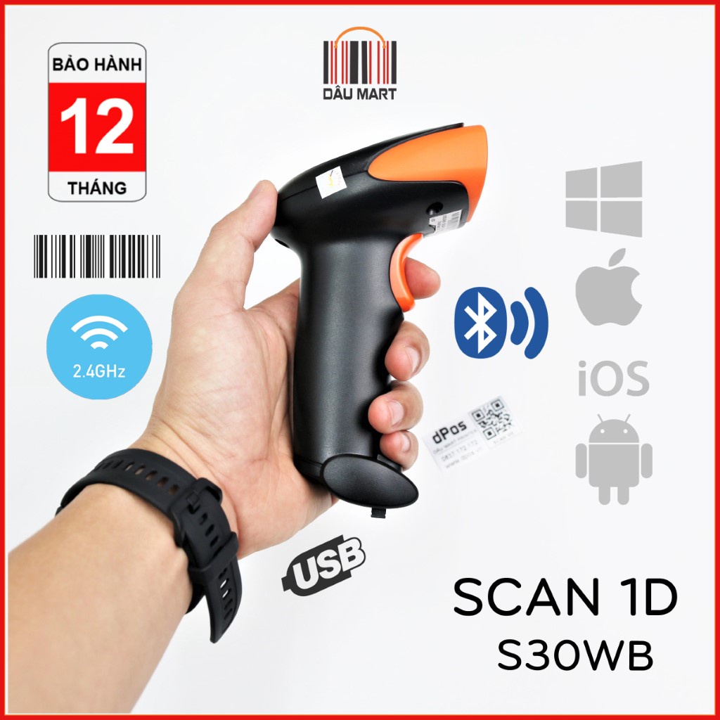 Máy quét mã vạch không dây Bluetooth dPos S30WB Scan mã vạch Barcode 1D dành cho shop bán hàng quản lý xuất nhập kho