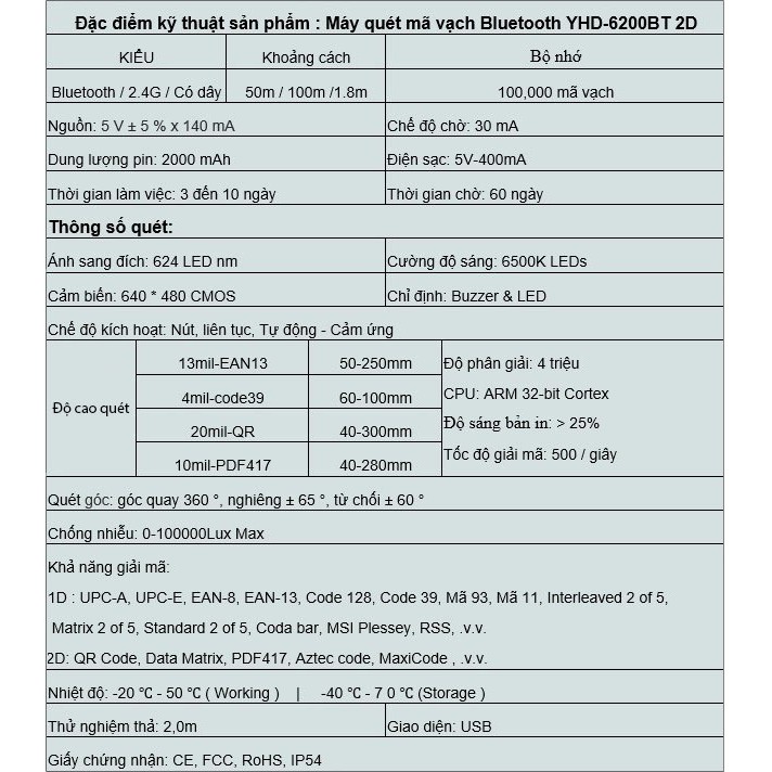 * Dòng sản phẩm: Máy quét mã vạch không dây YHD 6200DB 2D