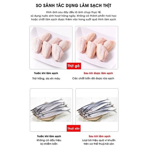 - Rửa sạch thực phẩm: Máy có thể loại bỏ hầu hết mùi lạ từ thủy hải sản, các mảng bám bẩn cứng đầu, hóa chất trên bề mặt củ quả nhanh chóng mà không hề gây hỏng thực phẩm.