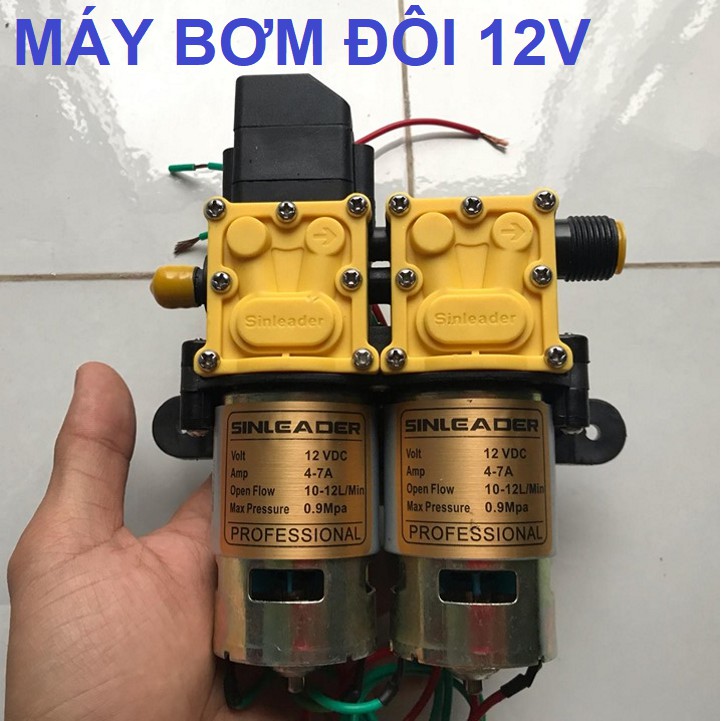 Máy rửa xe 12V với bơm đôi tăng ápBộ sản phẩm bao gồm : 1 Bơm đôi 12V - 0.9Mpa + Súng Rửa với dây 5M + ống hút dài 2M + cục lọc