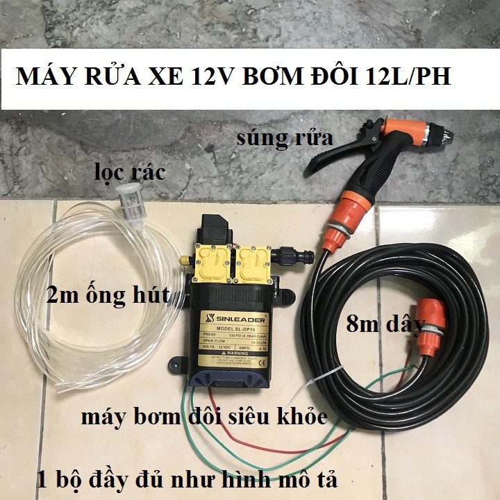 Bộ sản phẩm bao gồm : 1 Bơm đôi 12V - 130PSI + Súng Rửa với dây 8M + ống hút dài 2M + lọc rácỨng Dụng : Rửa Xe , Rửa Máy Lạnh Với Áp Lực Cao 0.9Mpa , phun sương ( tối đa lên tới 50 béc phun ) ,dây dài tối da 50m, xịt thuốc , tăng áp máy giặt , máy nước nóng , ...