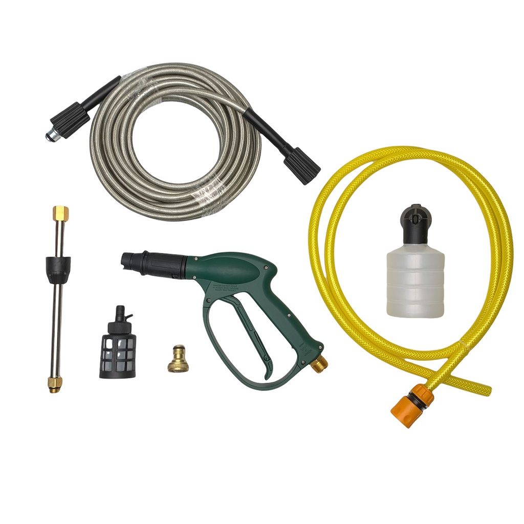 - Phụ kiện bao gồm : lọc nước, dây hút 2m, dây áp lực 8m, súng, bình bọt.