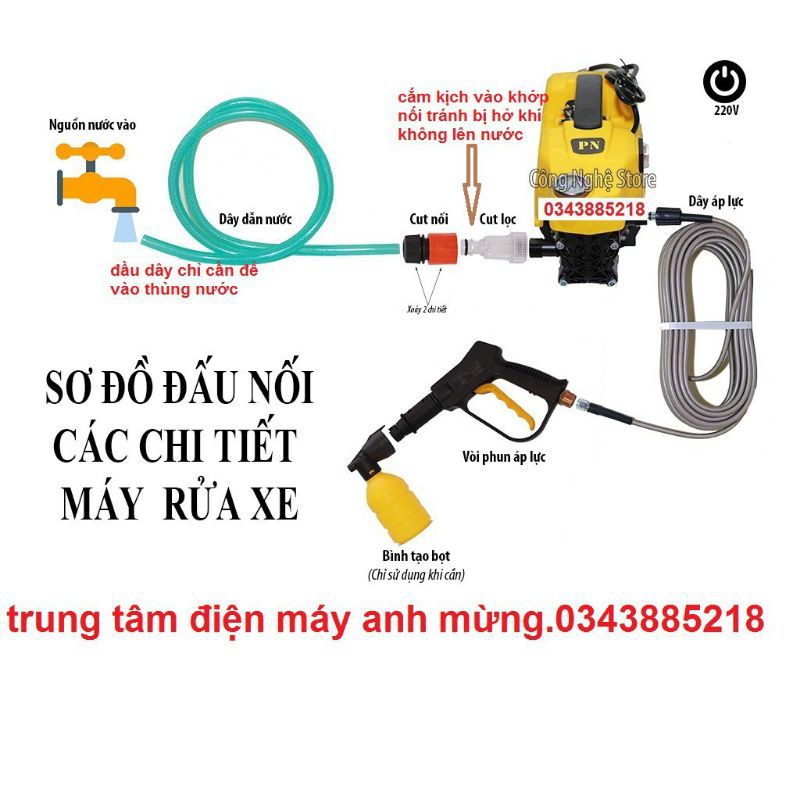 Phụ kiện: dây áp lực 15m + dây hút nước 1,6m, các đầu nối ., cút + 1 bình xà phòng, cần nối súng dài