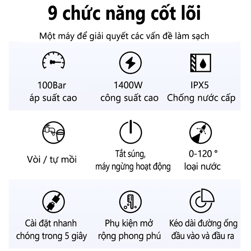 Công suất: 1400W.Áp lực phun: 100 bar.