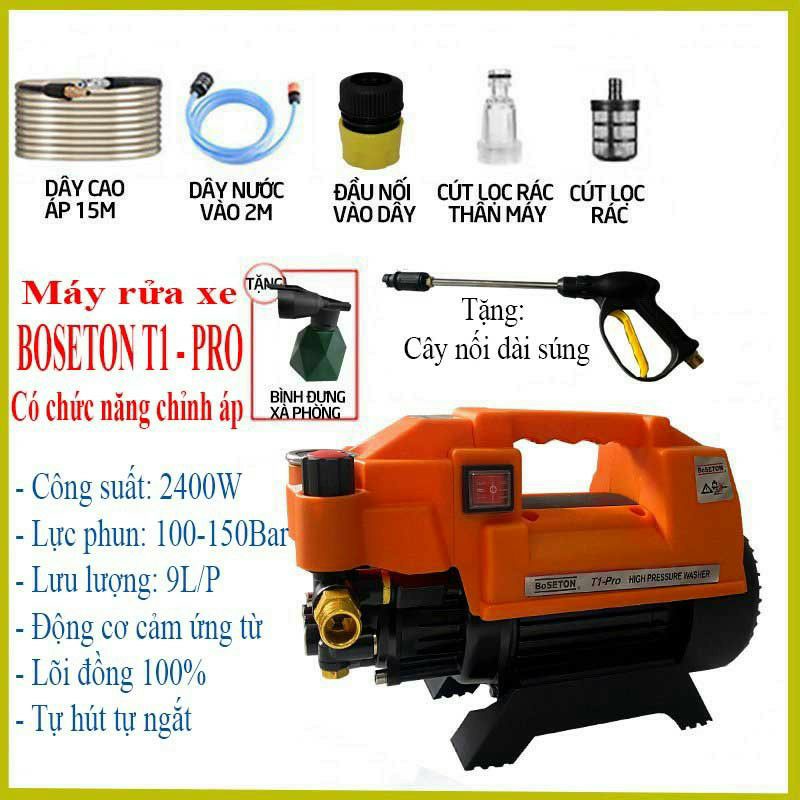 - Máy rửa xe chỉnh áp BoSeton (Osaka) T1 PRO với chức năng phun xịt rửa mạnh mẽ với khối động cơ motor cảm ứng từ hiện đại, giúp máy hoạt động êm ái với công suất lên tới 2400W, cho áp lực mạnh mẽ tới 150 bar.