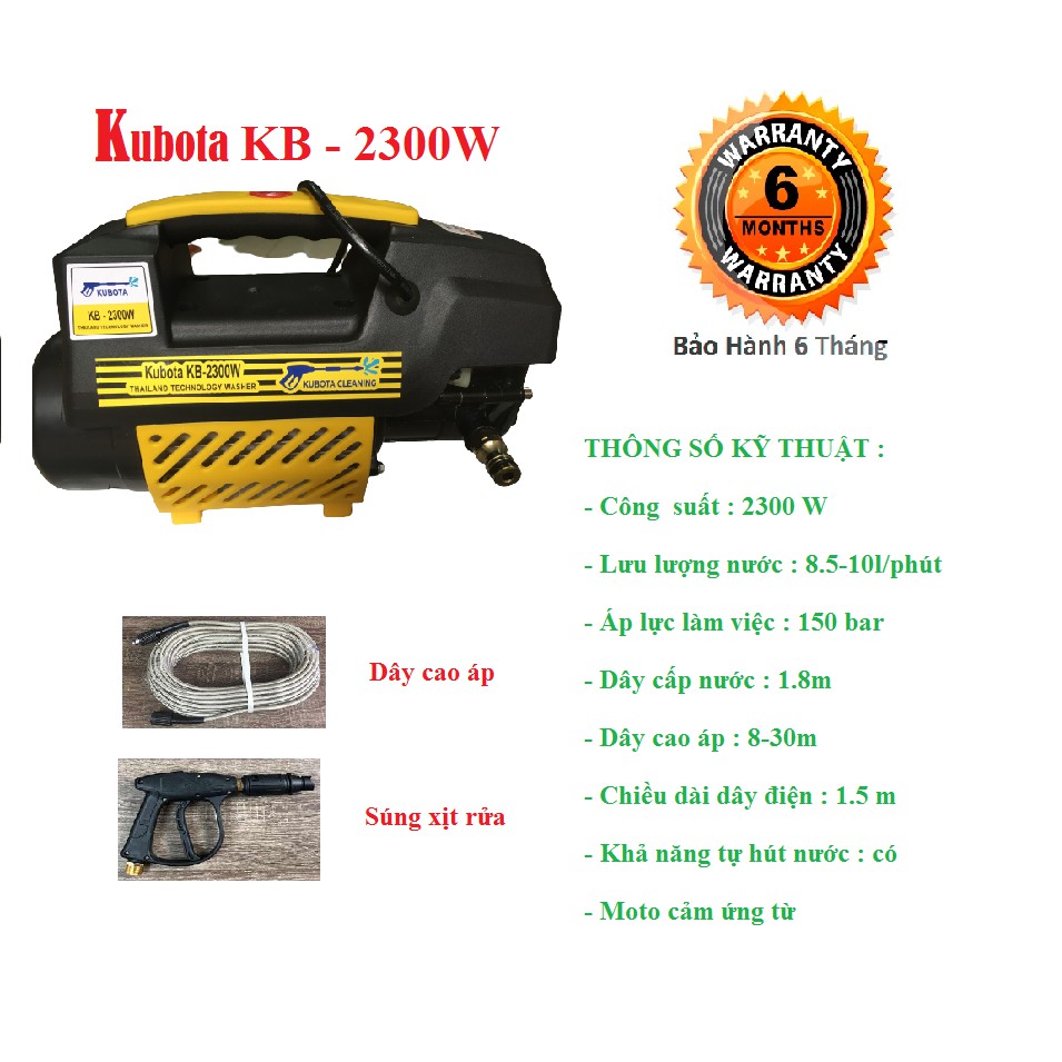 MÁY RỬA XE KUBOTA 2300WMáy rửa xe KUBOTA 2300W máy đẹp nhỏ gọn chất lượng hàng đầu,lõi máy 100% được làm bằng đồng cho độ bền cao,rất tiện lợi cho việc di chuyển:rửa ôtô,xe máy đặc biệt máy có thể vệ sinh điều hoà, tưới cây, xịt rửa tường nhà...