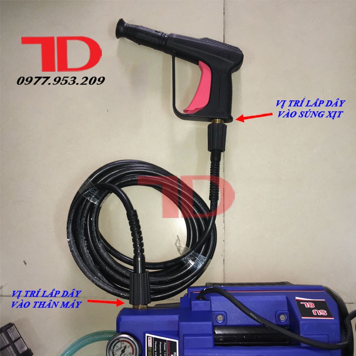 Bước 2: Dùng dây ống còn lại (màu đen) gắn 1 đầu với súng xịt, đầu còn lại gắn vào thân máy