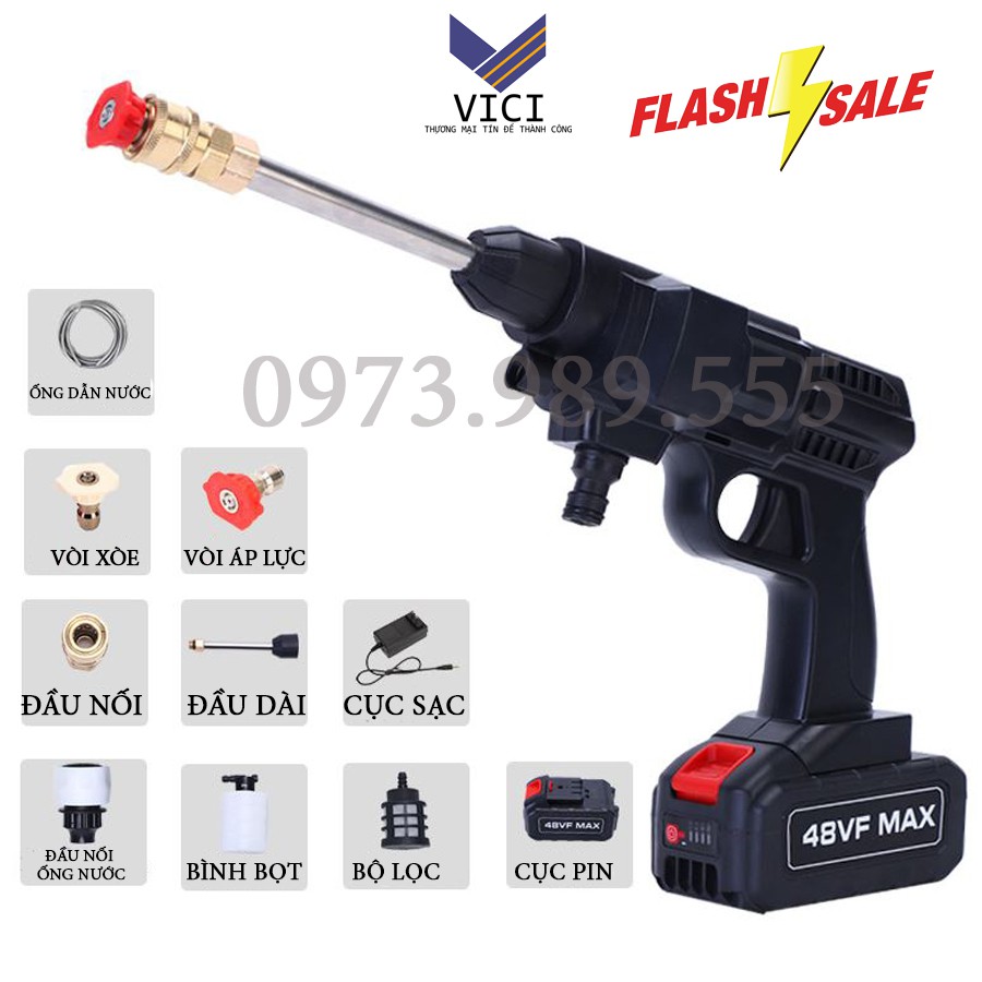 - Sản phẩm gồm: Thân máy + Pin lithium 48V + bộ sạc + 2 đầu phun tia/áp + bình bọt + thanh nối dài bằng thép không gỉ + đầu nối nhanh + ống dẫn nước 5 mét + hộp nhựa ABS đựng sang trọng.