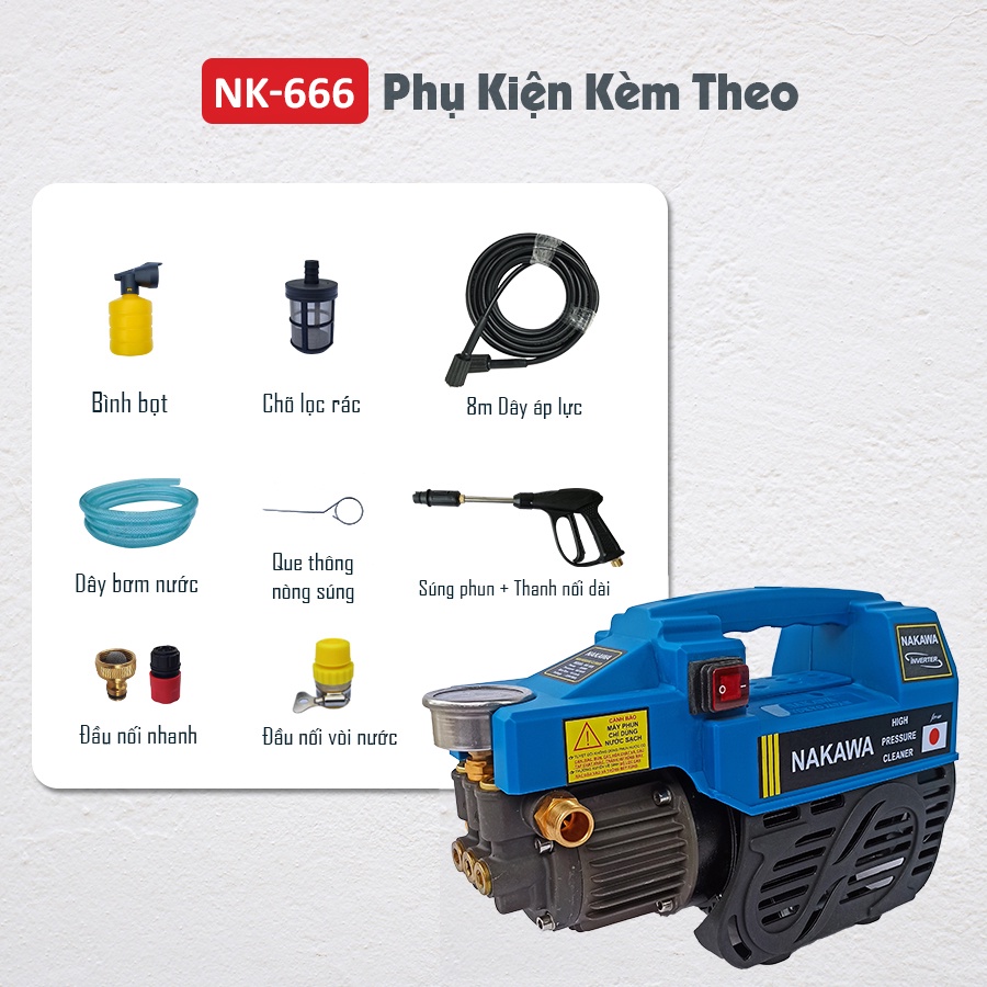 Nhà cửa & Đời sống > Dụng cụ & Thiết bị tiện ích > Dụng cụ > Máy rửa áp lực nước || Máy rửa xe NAKAWA NK666 công suất 2300W, Motor từ dây Đồng dùng cho gia đình phun rửa sân, ô tô, xe máyCòn hàng