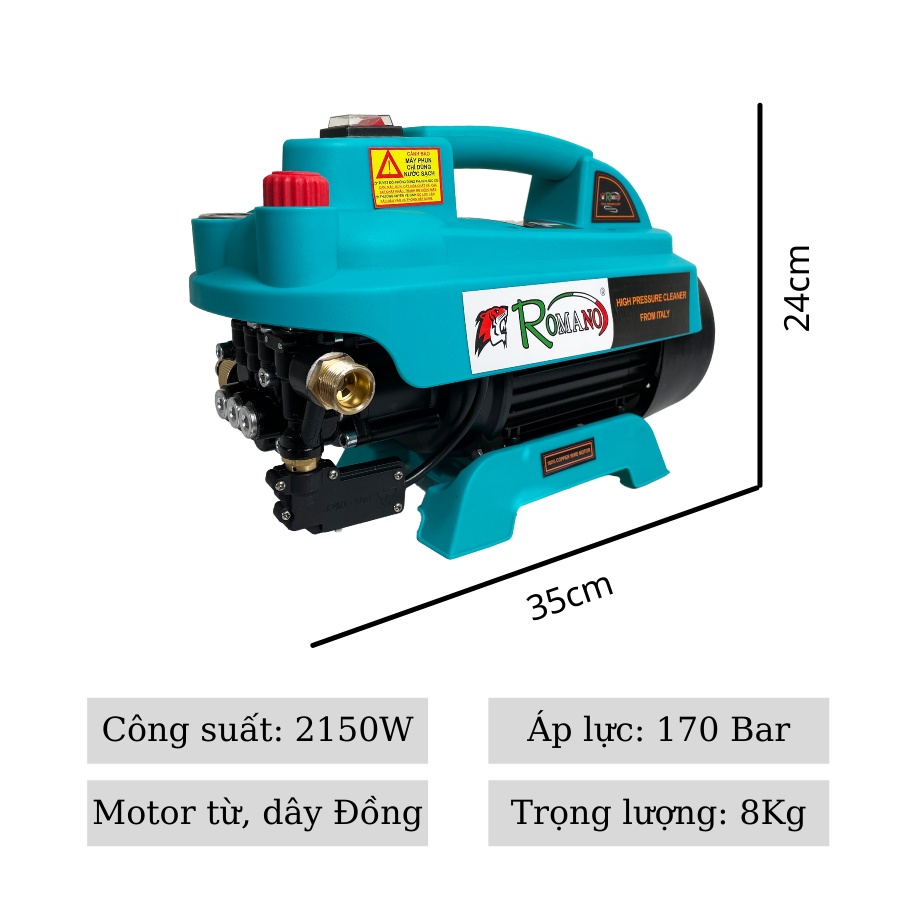 Máy rửa xe Romano RO2150A công suất 2150W có chỉnh áp, chống giật hiện đại bảo hành 12 tháng