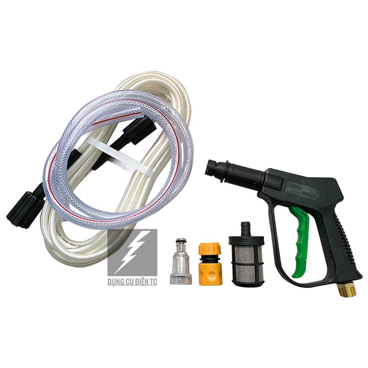 - Sản phẩm bao gồm: Dây cao áp 7m, dây nước vào 2m, khớp nối đầu vào, đầu lọc rác, súng phun ngắn và bình tạo bọt