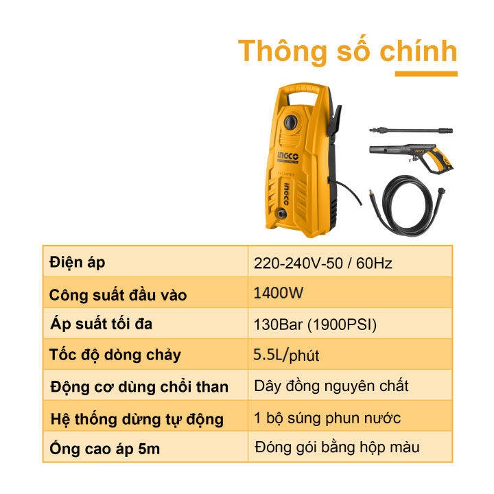 Thiết Bị Điện Gia Dụng > Thiết bị điện gia dụng lớn > Máy giặt & Máy sấy > Máy giặt || Máy rửa xe tăng áp INGCO HPWR14008 công suất 1400W.Còn hàng