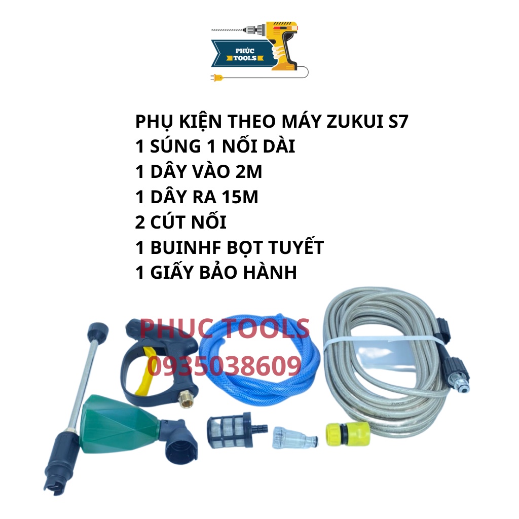 *** Bộ phụ kiện được trang bị cho máy Zukui S7 bao gồm: Thân máy + dây cao áp dài 15m + ống hút nước 2m + Đầu phun ngắn + bộ cút nước đầu vào + lọc rác. SHOP tặng kèm bình bọt xà bông + cây nối dài đầu phun