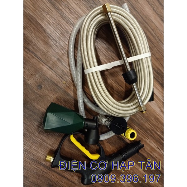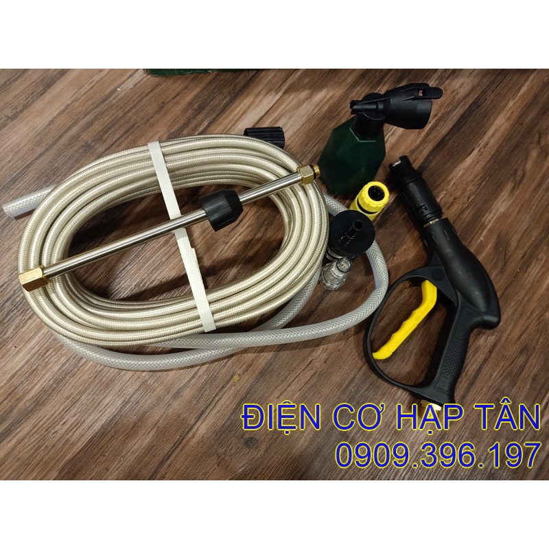 - Sản phẩm bao gồm: Đầu phun ngắn, thân nối dài, dây cao áp 7m, dây nước vào 2m, bộ cút nước đầu vào, bộ cút nước vào vòi nước, bình phun bọt xà bông.