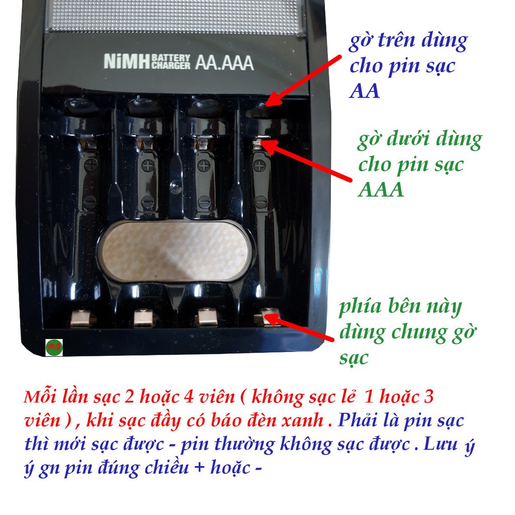 - Máy sạc có 4 hộc sạc , sạc được pin sạc AA , AAA ( có thể sạc pin sạc của các nhãn hiệu khác - và phải là pin sạc thì mới sạc được , pin sạc là pin có chữ recharge , pin thường không sạc được )